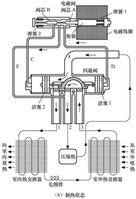 如上图(b)所示,当空调器设置为制热状态时,电气系统为导向阀的线圈提供驱动电压,线圈产生磁场,使衔铁右移。阀芯A、B 在衔铁和弹簧2 的作用下一起向右移动,阀芯A使导向毛细管D、E 接通,而阀芯B 将导向毛细管C 关闭。由于换向阀的活塞1通过D管、导向阀、E 管接压缩机的回气管,所以活塞1因右侧压力减小而带动滑块右移,将管口4与管口1接通,管口3 与管口 2 接通,此时室内热交换器作为冷凝器,室外热交换器作为蒸发器。这样压缩机排出的高压高温气体经换向阀的管口4和管口1构成的回路进入室内热交换器,利用室内热交换器开始散热,再经毛细管节流降压后进入室外热交换器,利用室外热交换器吸热汽化,随后通过管口3和管口2构成的回路返回压缩机。至此,一个制热循环过程结束。